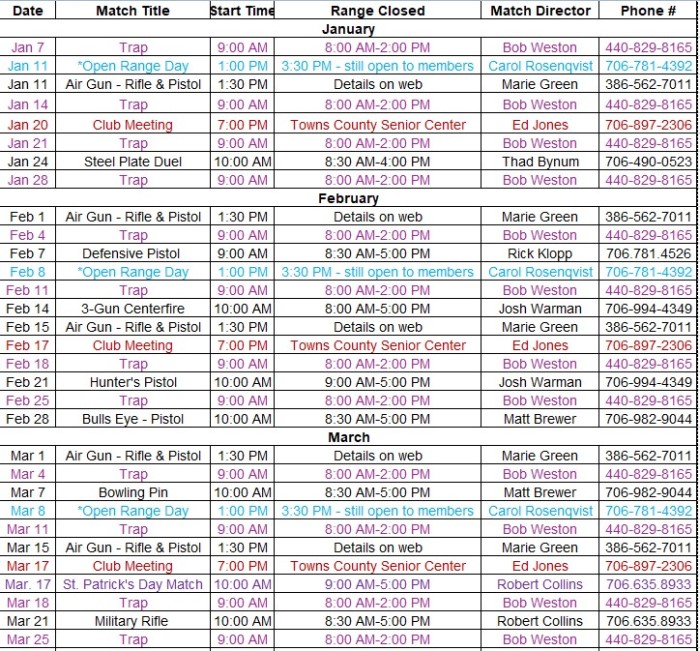 >>CHECK BACK HERE OFTEN, AS TIMES & DATES ARE SUBJECT TO CHANGE.<<NOTICE . . New Club Rules Please Read all here.Transport of Firearms from and to Vehicles. For both safety and convenience, all shooters coming to the range are required to place their firearms in a closed case. In this regard, firearms in a closed case may be moved from and to vehicles regardless of whether the Firing Line is Cold or Hot. Remember, all such firearms, must be Unloaded, and note that gun cases may not be opened while the Firing Line is Cold. All guns must be removed from the case and replaced in the case on a shooting bench/table with the muzzle pointed down range when Firing Line is Hot. Do not remove or replace guns in a case on a bench seat behind the yellow line.Match dates and times are subject to change, so check back here BEFORE you go to the Range.